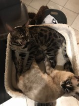Wir haben zwei junge Bengalkatzen, ein Junge und ein Mädchen aus demselben Wurf. Die beiden sind jetzt 9 Monate alt.