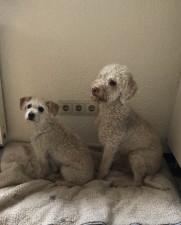 Unsere beiden Hundedamen Luna und Bijou bekommen als Futter einen Mix aus Naturflocken und Nassfutter. Die Nassfuttersorten wechseln bei uns alle zwei Tage. Die Flocken werden abgewogen und mit heißem Wasser übergossen, dann geht es auf die Gassirunde. Zurück von der Runde sind die Flocken aufgequollen und abgekühlt. Wir geben das Nassfutter dazu, vermischen alles miteinander und fertig sind die Hundemahlzeiten. Auf dem Bild sieht man die beiden, wie sie bei der Zubereitung des Futters auf der Decke in den Küchen warten.